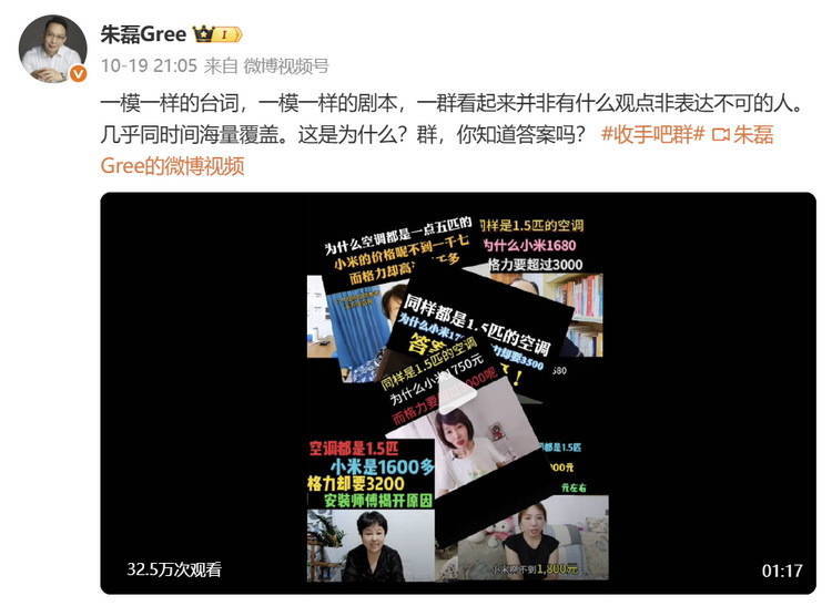 在10月19日,@朱磊Gree 发了一条微博,“一模一样的台词,一模一样的剧本,一群看起来并非有什么观点非表达不可的人。几乎同时间海量覆盖。这是为什么?群,你知道答案吗?”并附上视频。言下之意,是小米买了水军,攻击格力空调。
